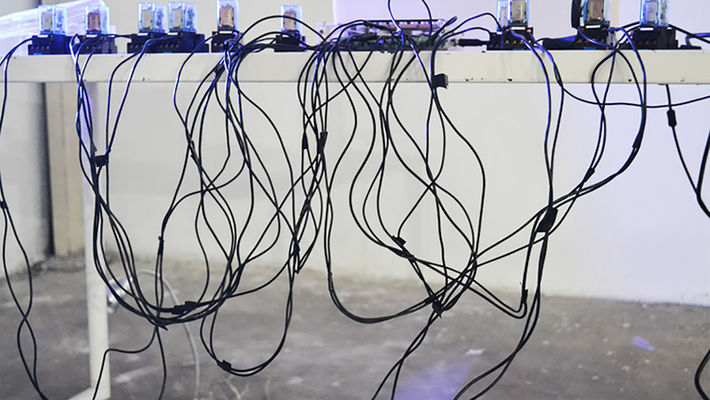The work is designed to create a kind of memorization of samples of space through a data capture - the amount of air surrounded by urban buildings “Hotel du lac , located in downtown Tunisia” . The collected data were transformed into a vibration and sound mechanism, created by a series of modular vibration motors.